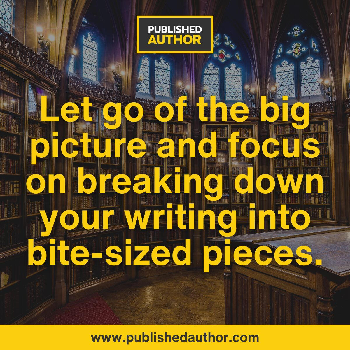 Don’t think about writing your book.Relinquish the big picture and focus on breaking down your writing into bite-sized pieces.Just write 1,000 words a day.If that feels like too much, cut it down to 750 or 500.That’s how you build a writing habit that will destroy writer’s block forever.