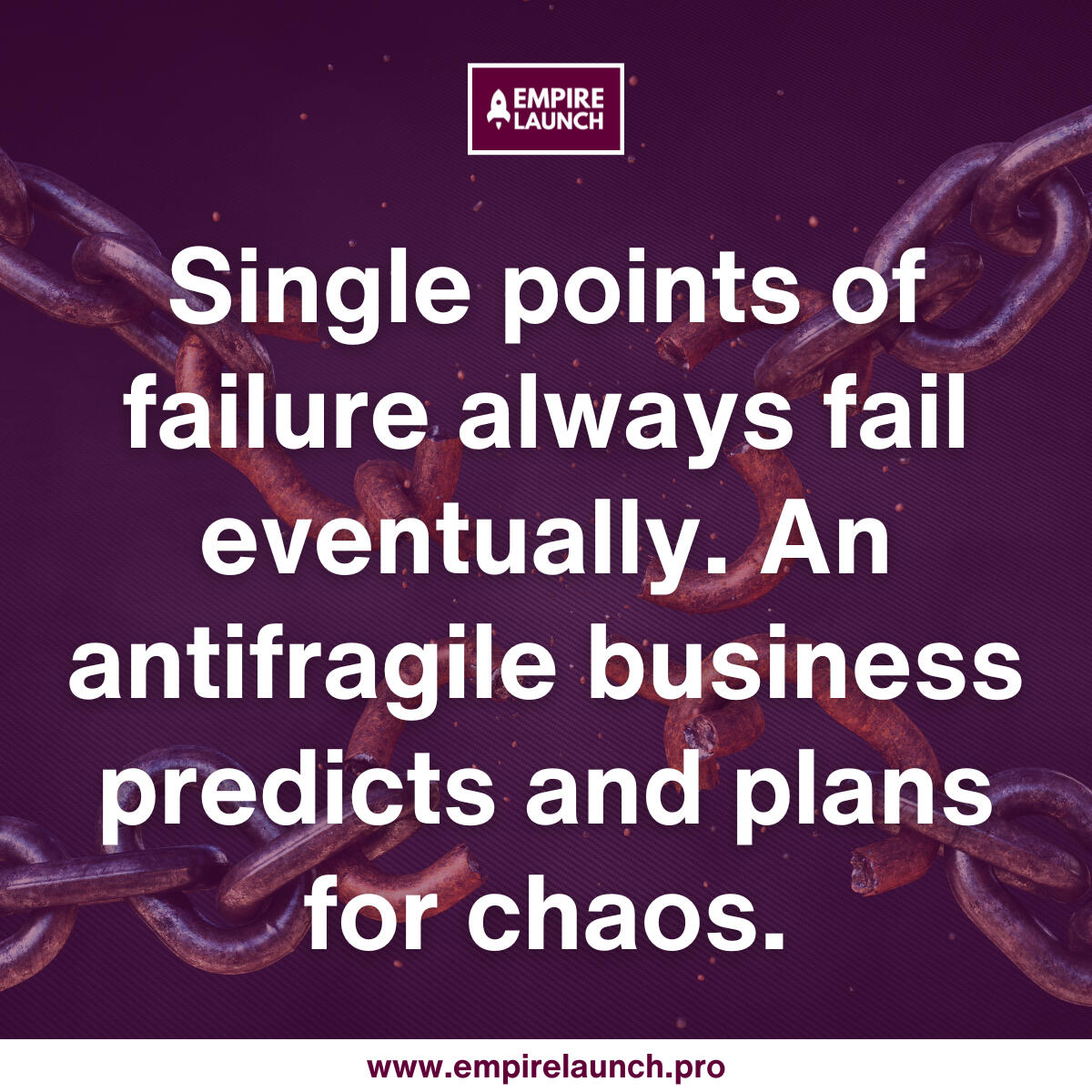 Single points of failure always fail eventually. An antifragile business predicts and plans for chaos.Don’t rely fully on a single sales channel, leader, or platform.What’s here today could be gone tomorrow.