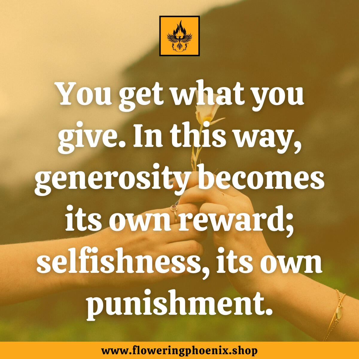 You get what you give.In this way, generosity becomes its own reward; selfishness, its own punishment.If you want to be loved, love.If you want to experience abundance, share.If you want to be happy, serve others.#virtue #generosity #love