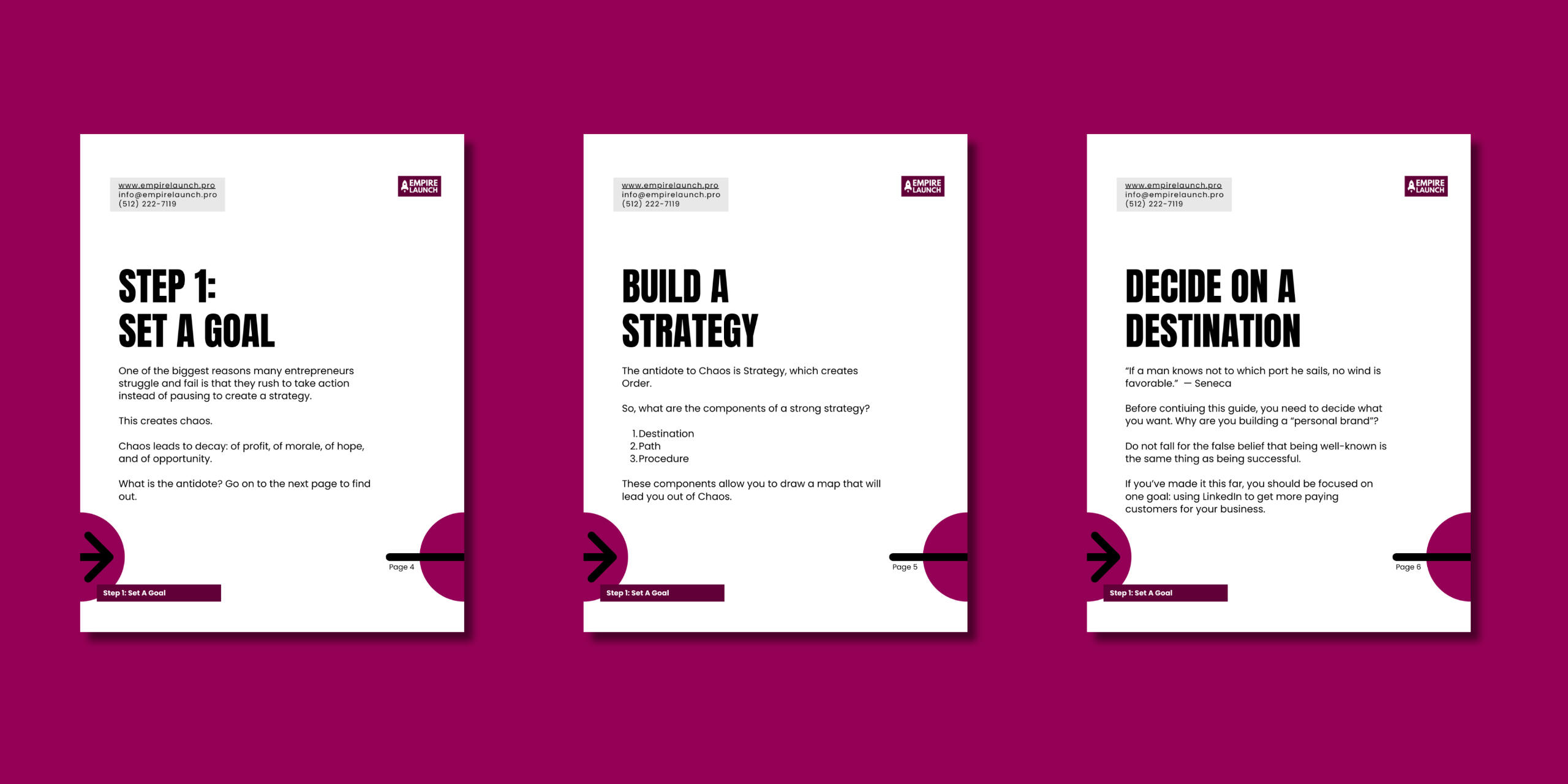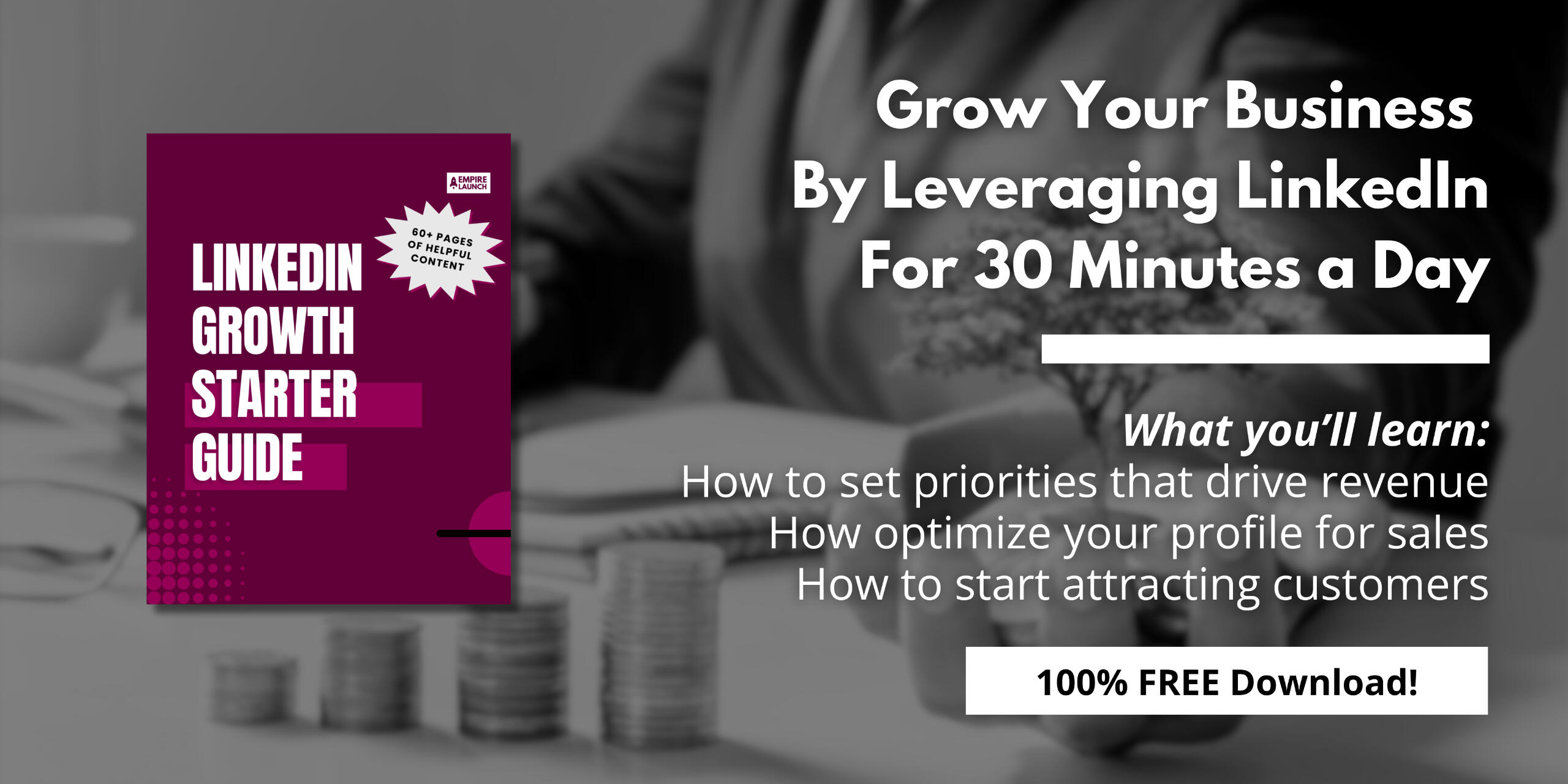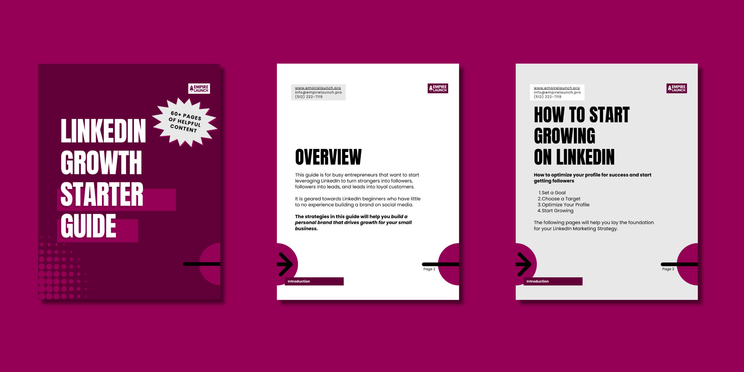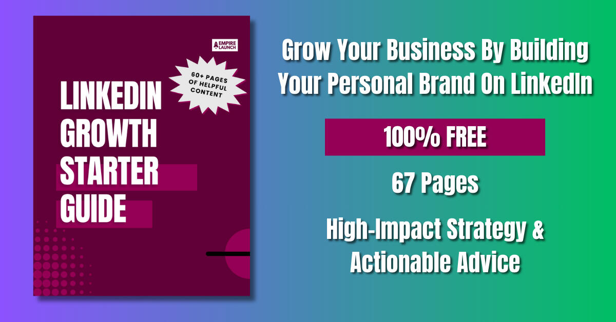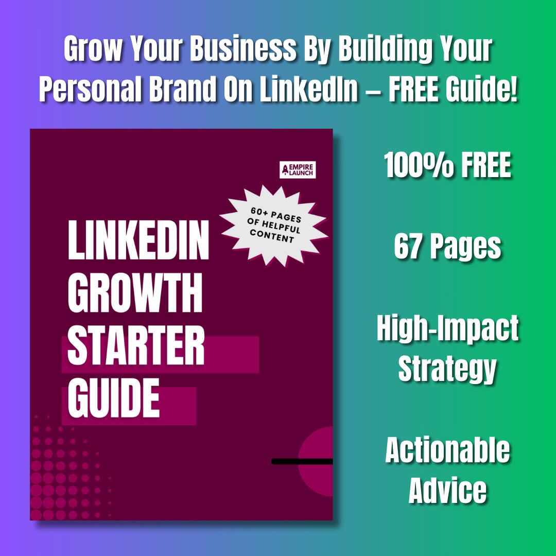 - FREE: Grow Your LinkedInPrimary TextWant to grow your business by building a personal brand on LinkedIn? This FREE guide will help!The LinkedIn Growth Starter Guide is an awesome FREE 60+ page resource to help entrepreneurs leverage LinkedIn to grow their business.This reference is built for both new and seasoned entrepreneurs who want to turn their LinkedIn profiles into 24/7 lead generation machines that attract cash to their companies.After reading this guide, you will have:- a firm goal (what you're striving for)- a clear target (who you need to market to)- a specific strategy (what actions you must take)to help you leverage LinkedIn to grow your business.Some things covered in this guide:- How to craft a specific and high-impact strategy to leverage LinkedIn to grow your business- How to avoid costly distractions that shipwreck so many entrepreneurs when they try to build personal brands- How to execute your LinkedIn strategy quickly and efficiently so that you can save your time and energy for other tasks- How to drive brand awareness and build trust in less than 30 minutes a day- How to optimize your profile to magnify the impact of your content strategy and attract money and opportunities 24/7